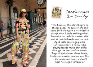 Immerse yourself in the warmth and playful essence of Italian style, culture, and time-honoured traditions with The Sundowners In Sicily print. This vibrant floral print takes a page out of the Italian rulebook to embrace la dolce vita—the sweet life. As the sun starts to set, it's aperitivo hour, and the atmosphere comes alive. Spritzes perch on tables adorned in kitsch and colorful cloth, creating a scene that embodies the joyful spirit of gathering with loved ones.