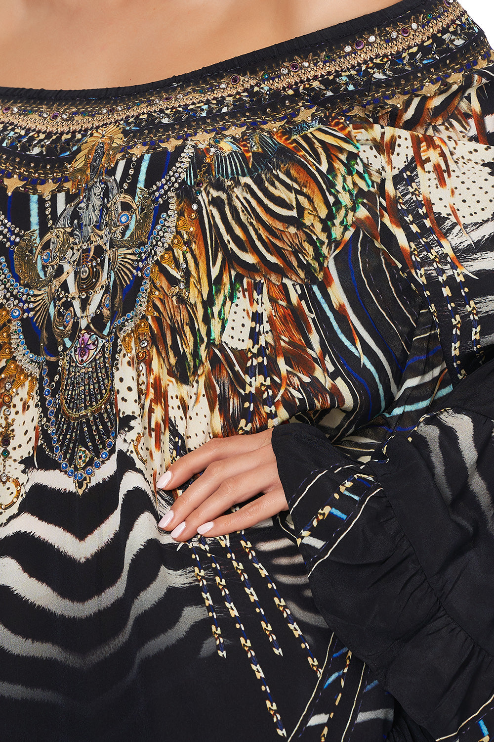 This enchanting relaxed-fit long sleeve dress can be worn on or off the shoulder, adorned with delicately hand placed crystal embellishments along the elasticated neckline and a flattering frill sleeve and hem for whimsical charm.