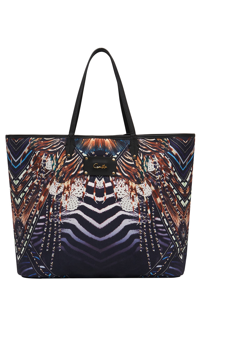 This relaxed canvas bag features a matching detachable purse with zip, internal zip pocket, magnetic snap fastening and 100% leather straps in an all over statement CAMILLA print.