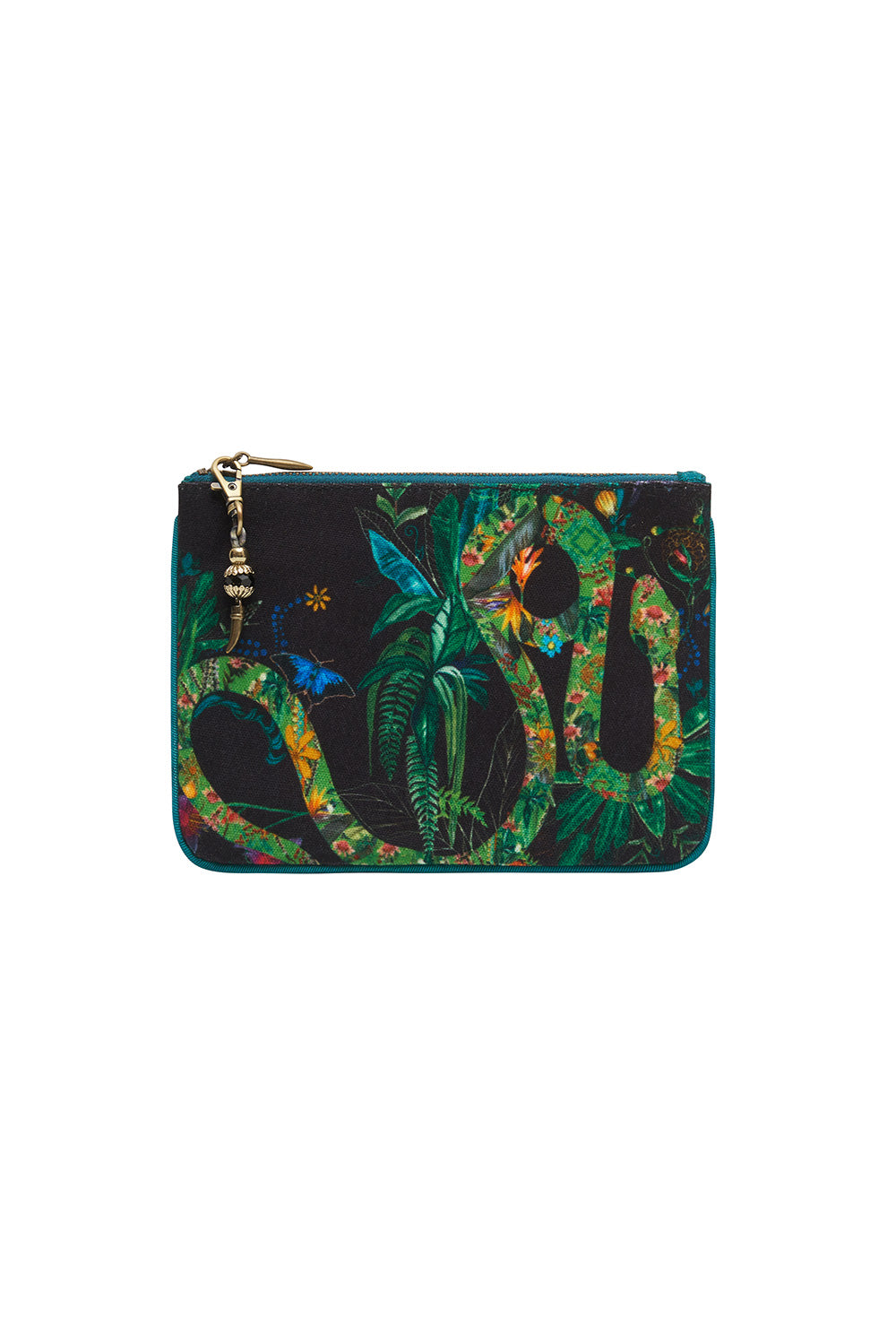 Set against a hypnotic rainforest canvas, the River Cruise Coin and Phone Purse draws inspiration from a dusk river cruise along the Daintree. This printed purse features a charming tassel, parrot clip, internal zip pocket, as well as contrast piped edge as detail.