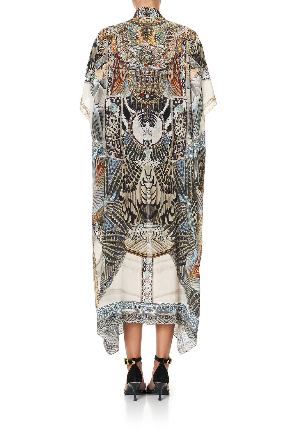 Hushed tones and fine-lined feathers tell a tale of falconry, found in the ancient traditions of China, as they float across our Girl On The Wing Kimono Coat.