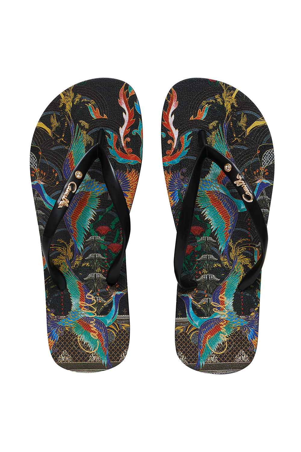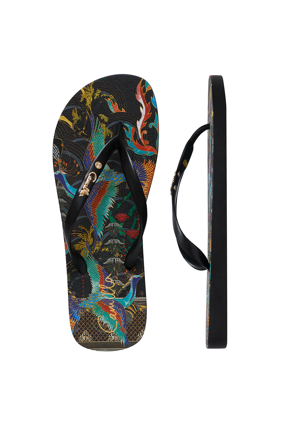 A set summer essential footwear reimagined with a scene of Persian folklore creatures during their night flight, the Wise Wings Thongs are a chic addition to a luxe resort wear wardrobe. Crafted with a soft
