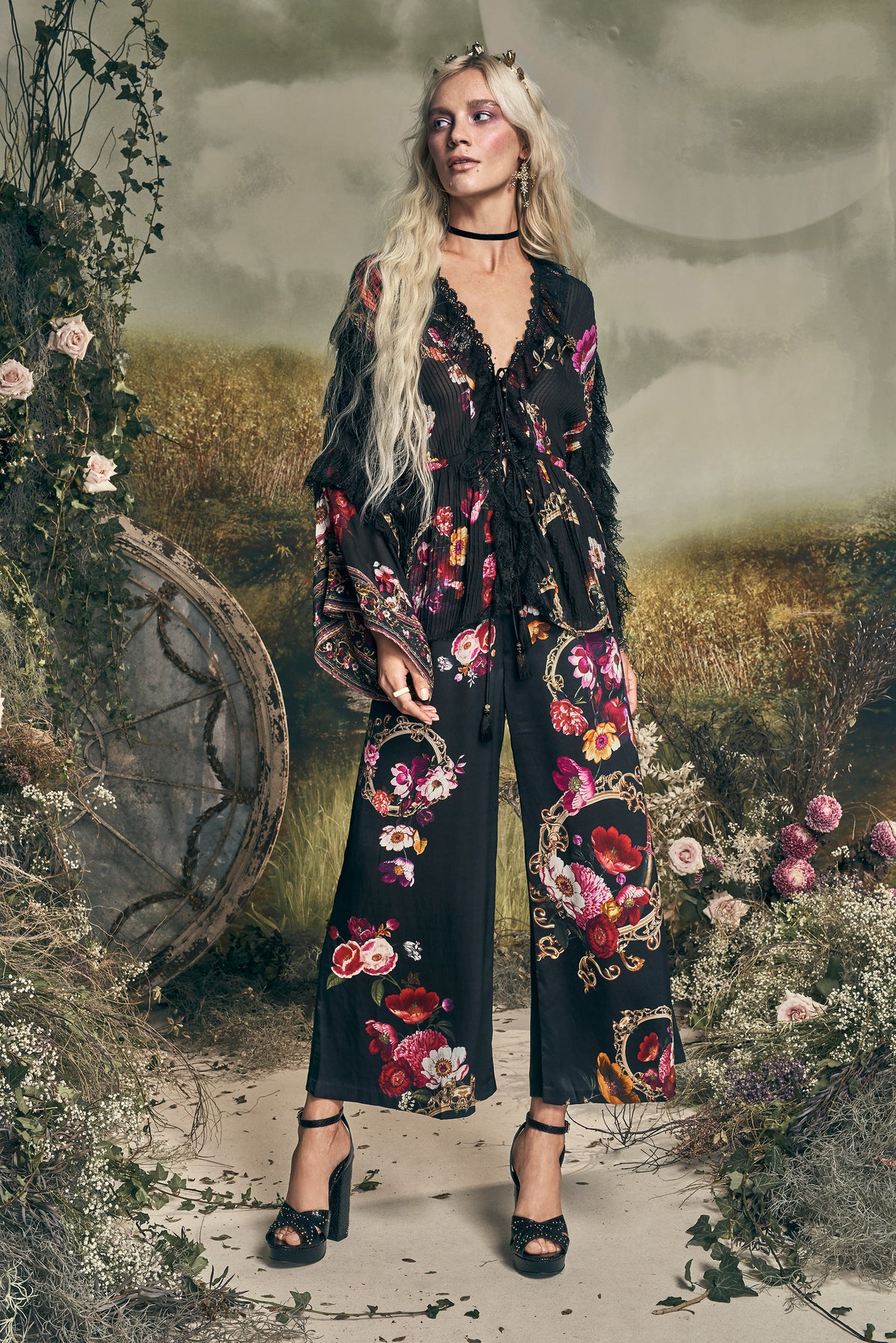 A magnificent piece of luxe soft suiting, the Mirror Mirror Cropped Lounge Pants are effortlessly chic. Crafted in a black silk enriched with a print inspired by studies of Cinderella, these cropped trousers feature a soft boho flare, elasticated drawcord waistband and in seam pockets. A magical piece for gypsy lounging or paired back with matching cami for an elevated evening look.