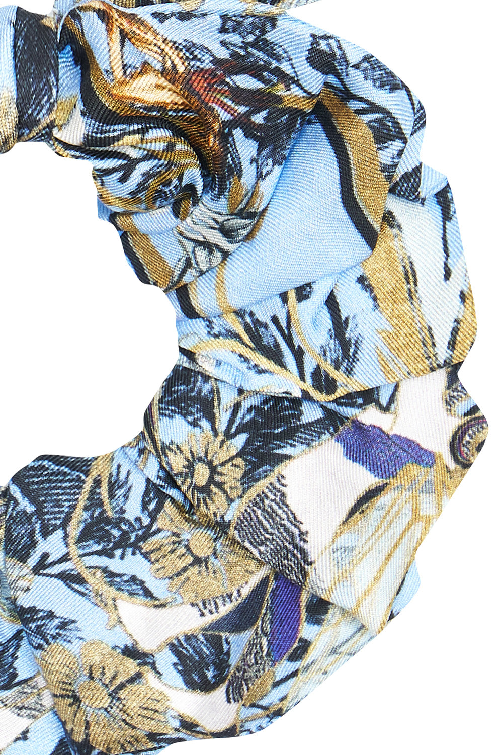 A staple accessory with a feminine mystic touch, the Fairy Fountain Scrunchie showcases the gentle fairytale blue hues of this magical print. Crafted in buttery soft silk, this scrunchie is an effortless statement that ensures