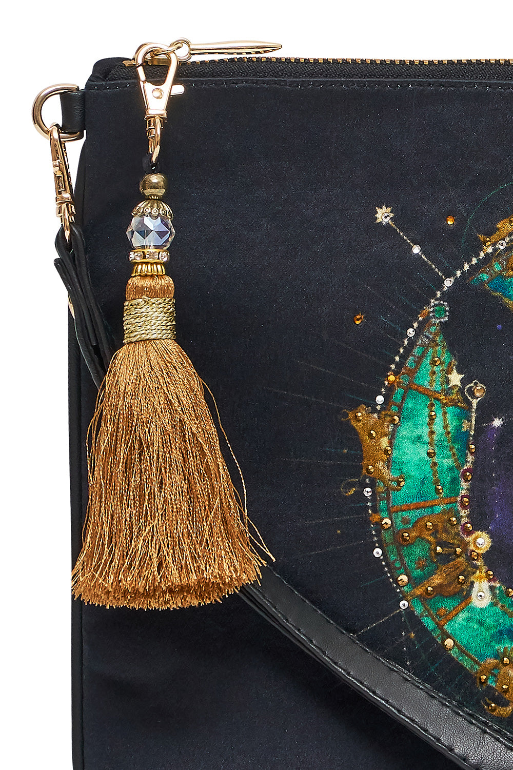 A mesmerising statement clutch radiating with zodiac and panther motif, the Solid Black Zip Top Clutch tells a story of Persian folklore against a midnight canvas. Crafted from a soft printed silk designed with a bespoke CAMILLA print, it features a practical parrot clip, internal zip pocket, a lightweight leather wristlet, as well as hand-placed crystals, beaded embroidered and tassels as detail. Perfect for safely storing the essentials whilst offering an element of statement luxe to any outfit.