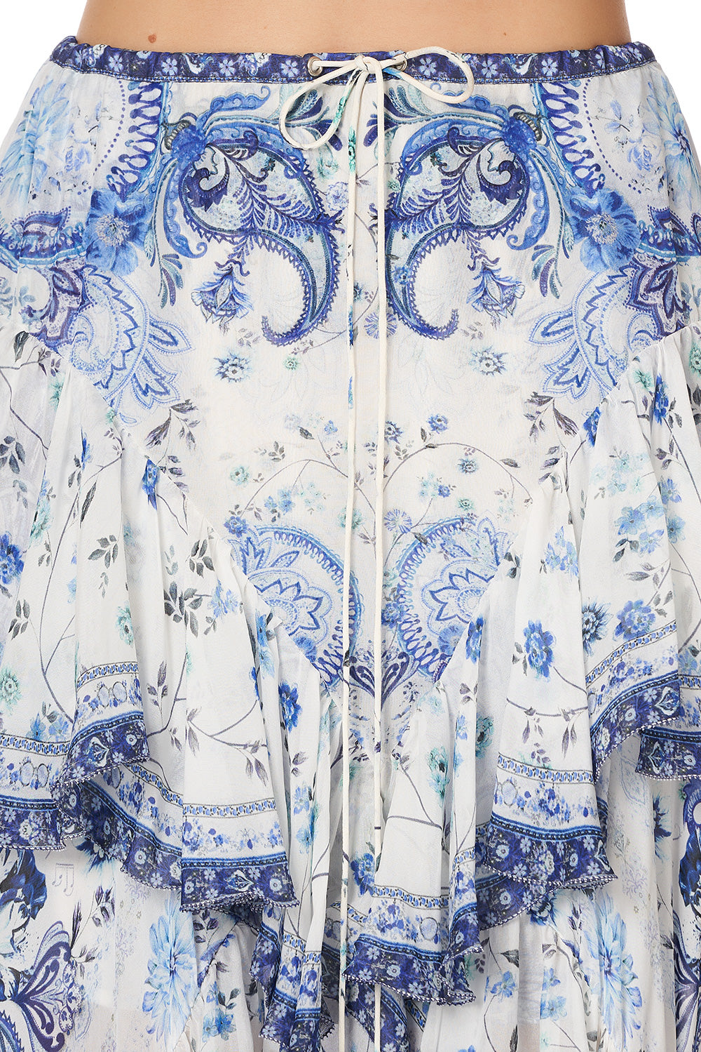 A pretty peasant-style skirt enriched with bohemian florals and blue and white paisley. Our Talking About A Revolution Maxi Skirt With Double Frill is a full-length skirt that comes to life across a canvas of