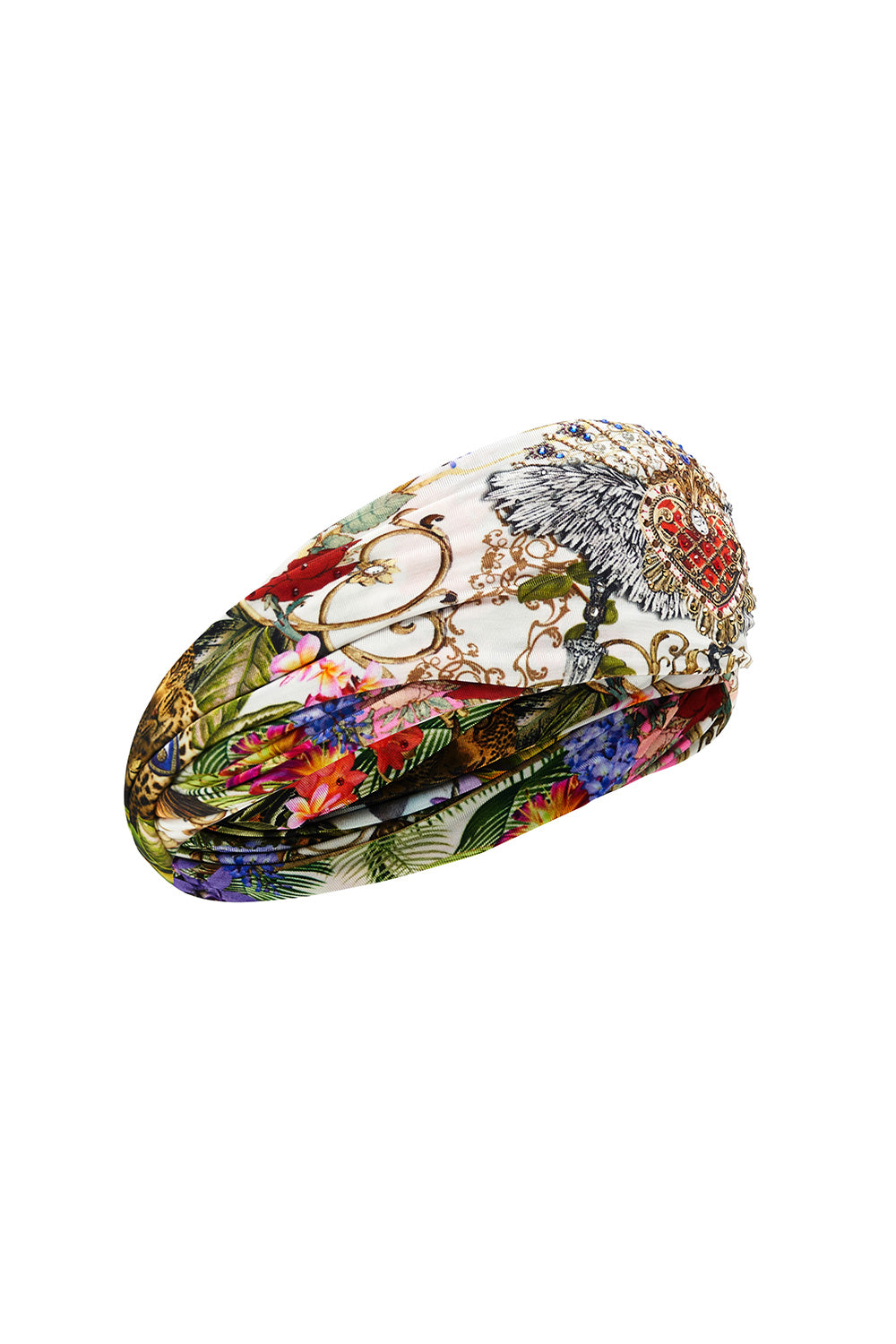The vibrant crowning glory to your Fair Verona ensemble, the Fair Verona Jersey Head Wrap is an eye-catching piece of boho headwear. Adorned with whimsical characters, wearing crowns of their own, this fun turban style headband is inspired by a forbidden love story. A CAMILLA crystal embellished heart sits centre stage amongst the leaves of a vibrant tropical garden. Crafted from a soft stretch fabric for the perfect fit, this versatile headpiece can be worn out to lunch or with matching print swimwear for a resort statement.