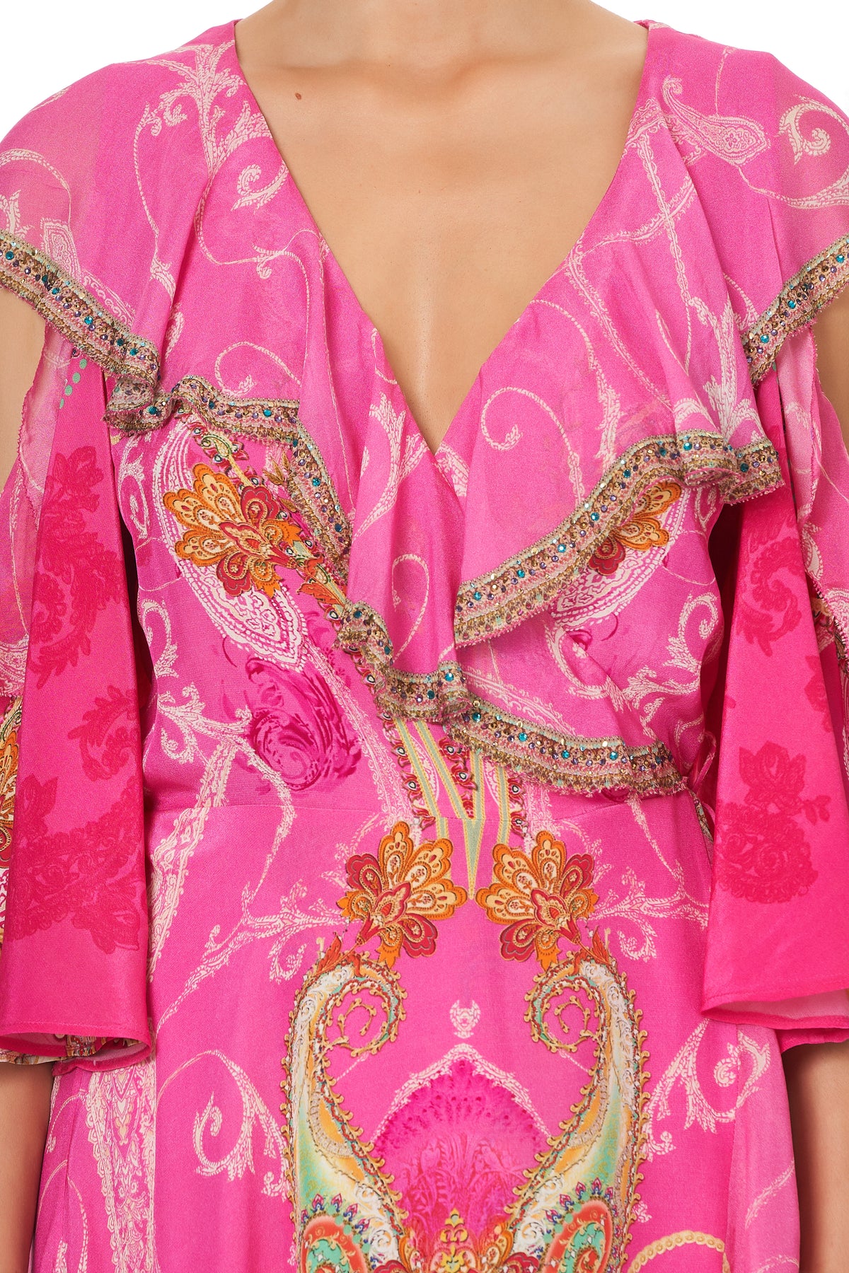 Embodying the rebellious spirit of an aristocratic mistress, the Rainbow Rhythm Ruffle Drop Shoulder Dress is inspired by a flurry of illicit royal affairs. A passionate shade of hot pink acts as a silk canvas for gilded accents entwined with a dalliance of paisley. Designed in a romantic wrap style, flirtatious ruffles skim the sleeves, neckline and hem, evoking the wild bohemian spirit of CAMILLA. The sultry off-shoulder sleeves cast a feminine silhouette, while hand-placed crystals depict the glamorous lifestyle of our scandalous muse. Wear back with summer wedges for a resort season aesthetic or with killer heels to amp up the mischief.