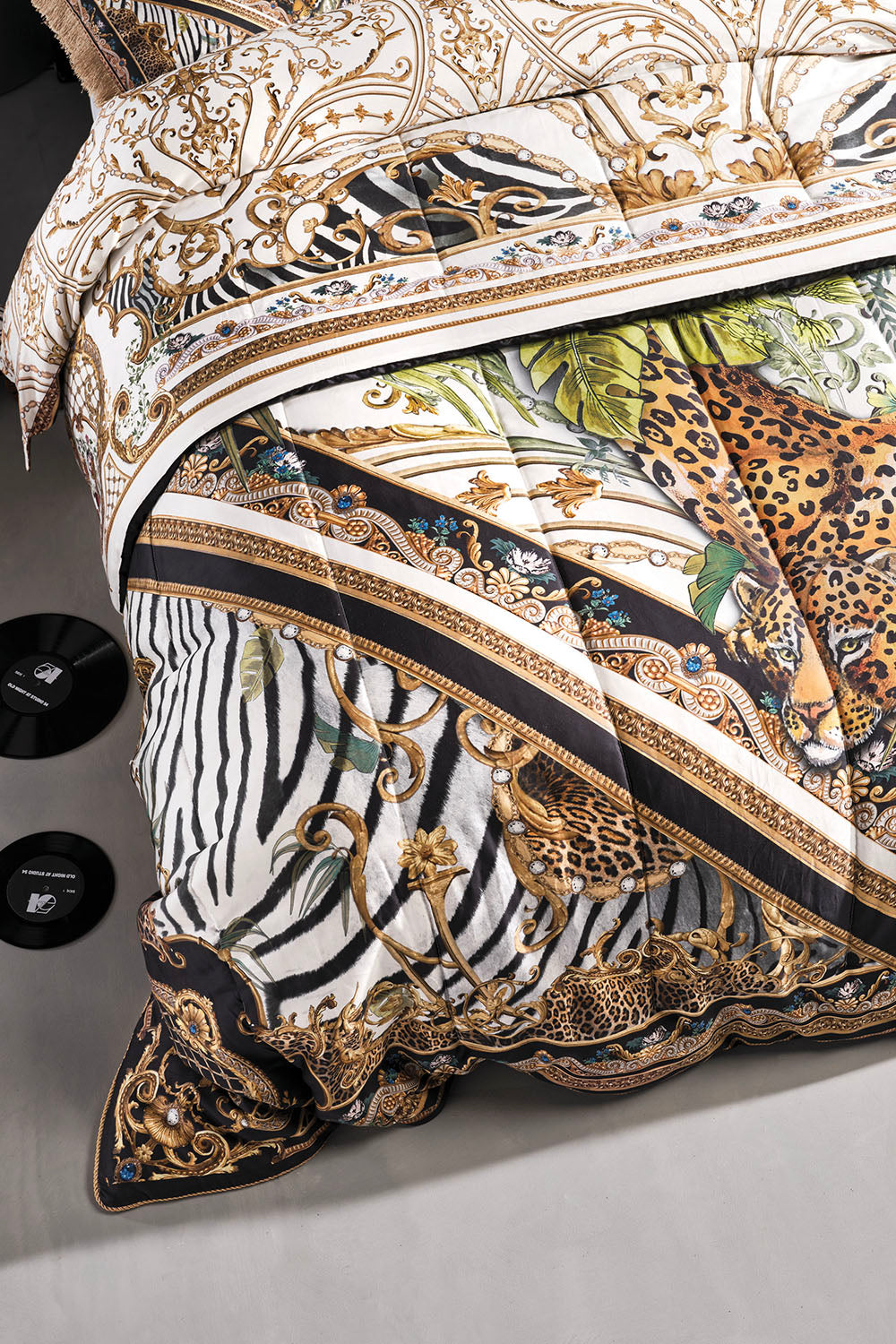 A celebration of Grace and her iconic style, the Night Waiting For Day Quilted Bed Cover is a celebration of a Disco Queen's inner feline. This set is heavenly debauchery set on a print that