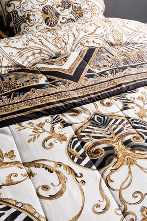 A celebration of Grace and her iconic style, the Night Waiting For Day Quilted Bed Cover is a celebration of a Disco Queen's inner feline. This set is heavenly debauchery set on a print that awakens in hues of gold and zebra. A 500 thread cotton sateen quilt cover boasts a lavish digital print, opulent dual printed sides, luxurious quilted filling and finished with contrast piping as detail. Style over the matching Night Waiting For Day Queen, King or Super King Bed Quilt Cover Set and European Pillow Case.