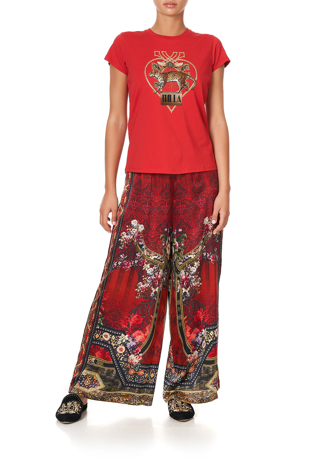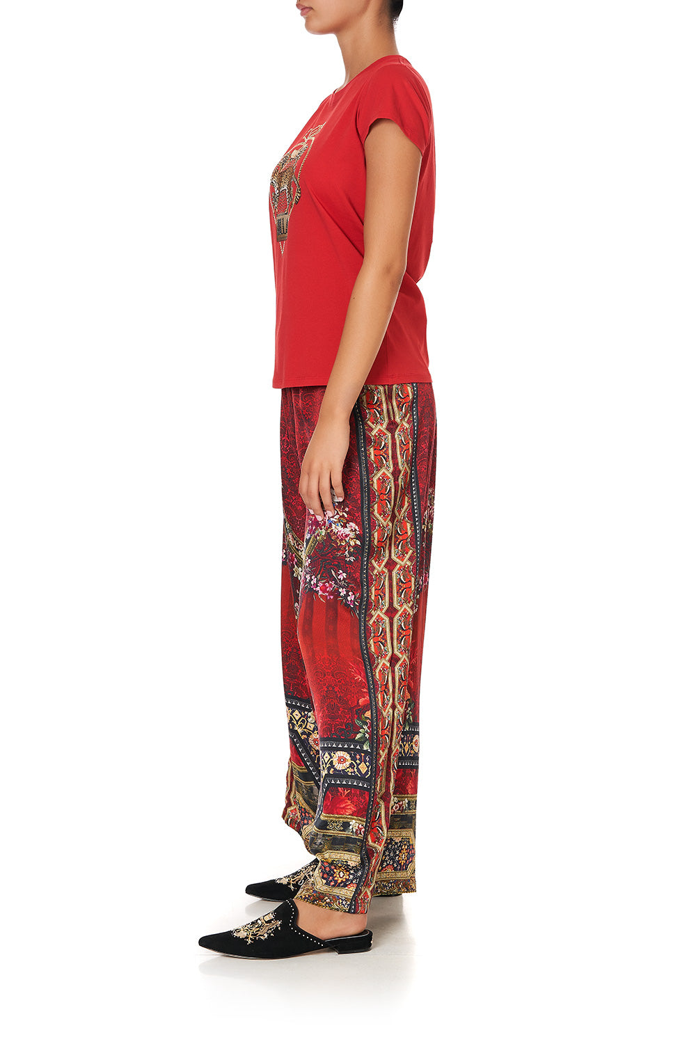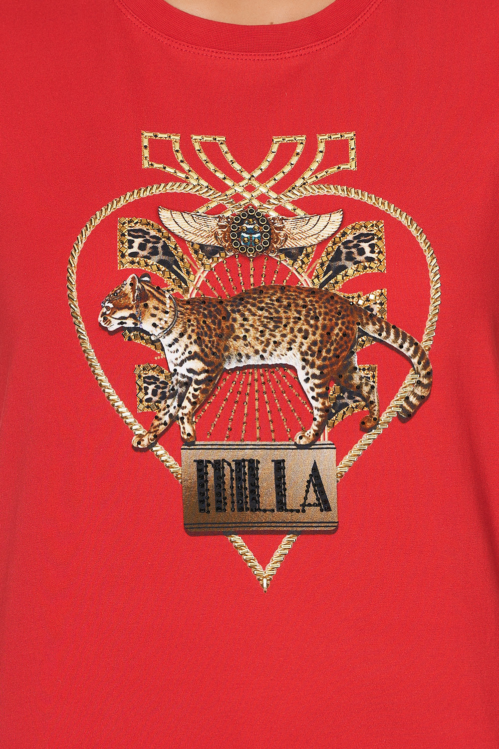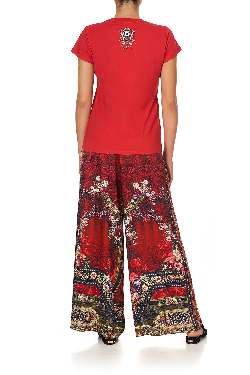 The Epitome of nonchalance, the Stories of a Station Slim Fit Round Neck T-Shirt makes for essential everyday wear. A canvas of lavish red infused with dazzling hand placed CAMILLA crystals telling a story of