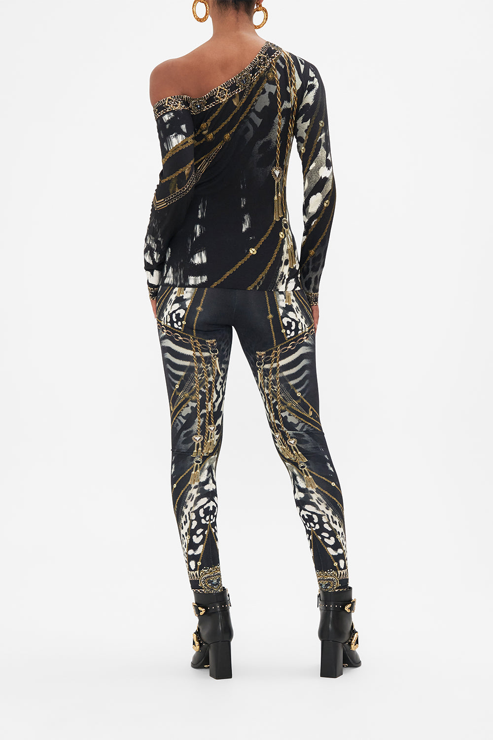 The Untamed Royalty Off Shoulder Jersey Top draws back a lavish curtain of wild animal patterns elegantly embellished with gold chains. Luxurious lengths of silky rope and tassels adorned with trinkets and charms that dance amongst the shadows. Created in a soft jersey, this luxury long sleeve top plays host to a sleek silhouette with slim sleeves that dances at the wrist, and an elegant off the shoulder neckline to showcase the decolletage. Lovingly handcrafted and designed in Australia, explore more from The Moral Of The Story: Act II collection.