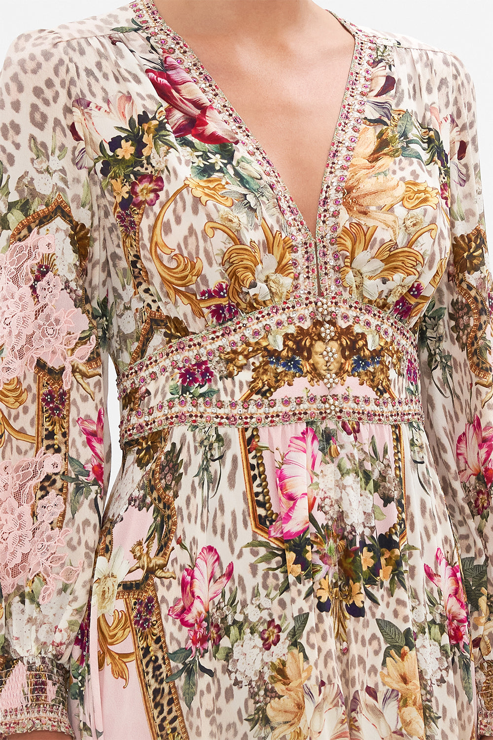 The Bambino Bliss Button Dress With Shaped Waistband echoes the sweet symphony pastel pinks awashed in opulent florals and leopard print dancing beneath grand gilded archways. Crafted in luxurious silk crepe, this CAMILLA maxi dress