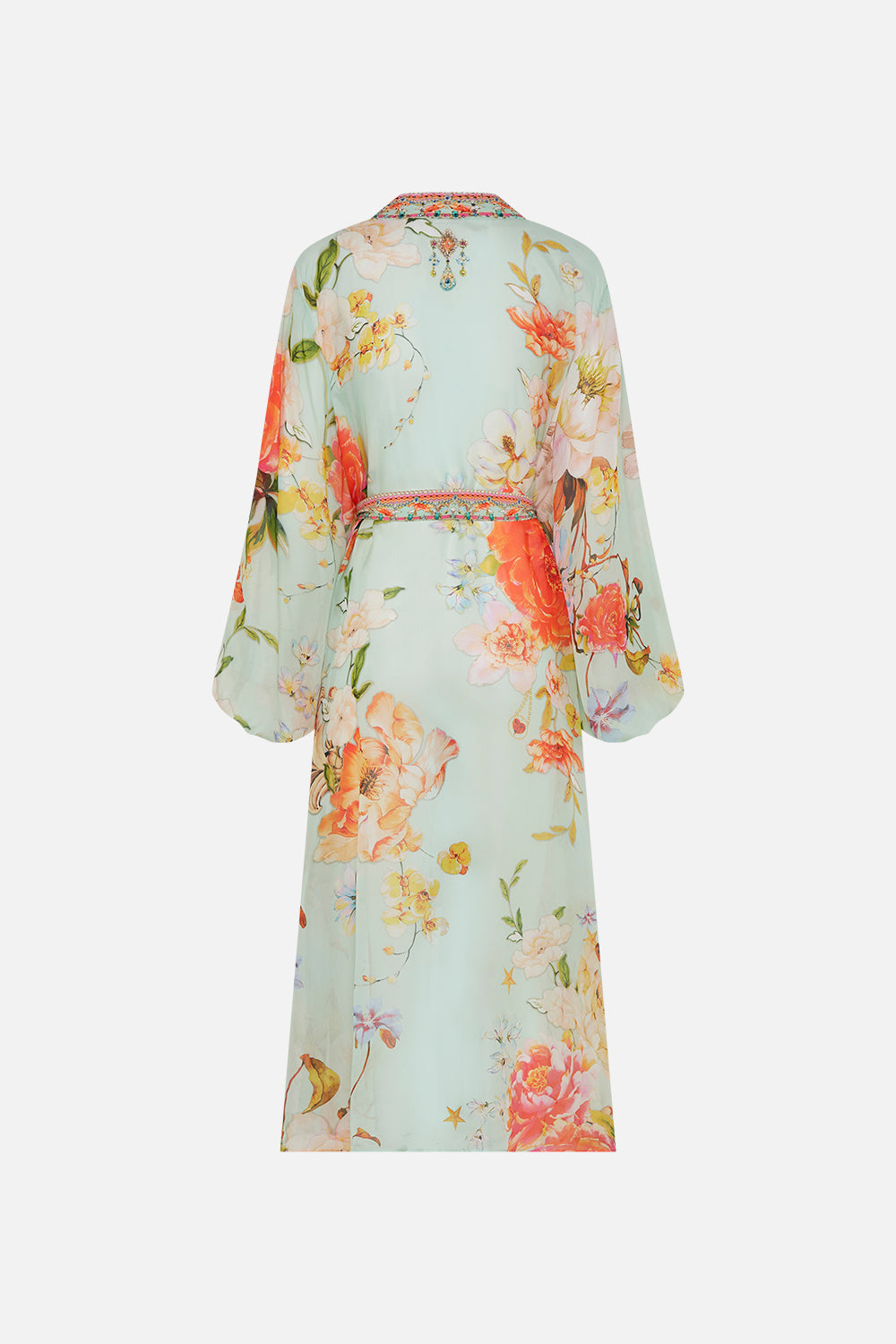 The Talk The Walk Blouson Sleeve Layer is a sensual immersion of fragrant blooms. Subtle glimmers of hidden jewels and gilded flourishes dance amongst the soft mint ambiance. Finished with hand-embellished CAMILLA crystals, this luxury silk layering piece is home to statement blouson sleeves that dance at the wrist, contrasting neck bands that line the full length edge and a relaxed maxi silhouette designed to be worn effortlessly open or wrapped and cinched in with waist tie enclosure. Lovingly handcrafted and designed in Australia, explore more from The Moral Of The Story: Act II collection.