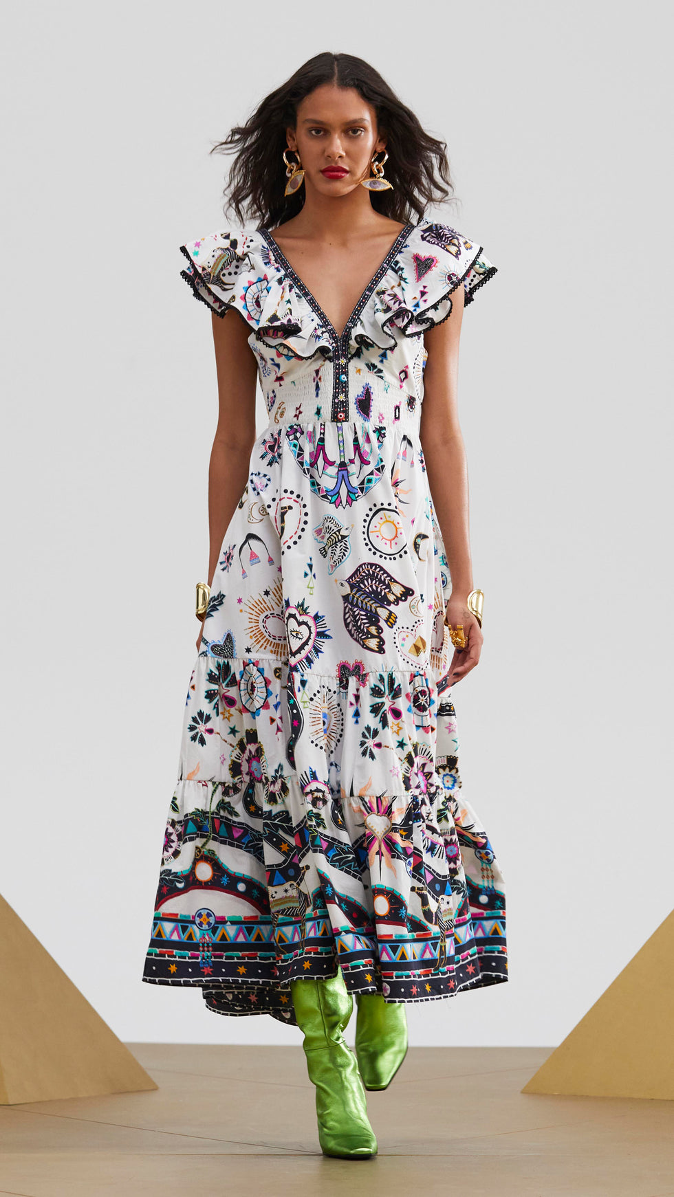 Designed in Australia, The Nubian Wonderland Wide Sleeve Gathered Dress awakens the identity and artistry amidst the Nubian Village with accenting contrasts, vivid embroidery and geometric depictions. Lovingly handcrafted, this luxury maxi dress features a relaxed full length silhouette with a cascade of tiered panels throughout the drop waistline and flared skirt. The poetic billow of this dress is complimented with flared raglan sleeves finished with elegant ruffled hems.