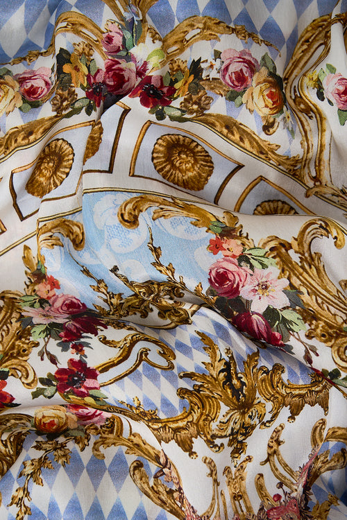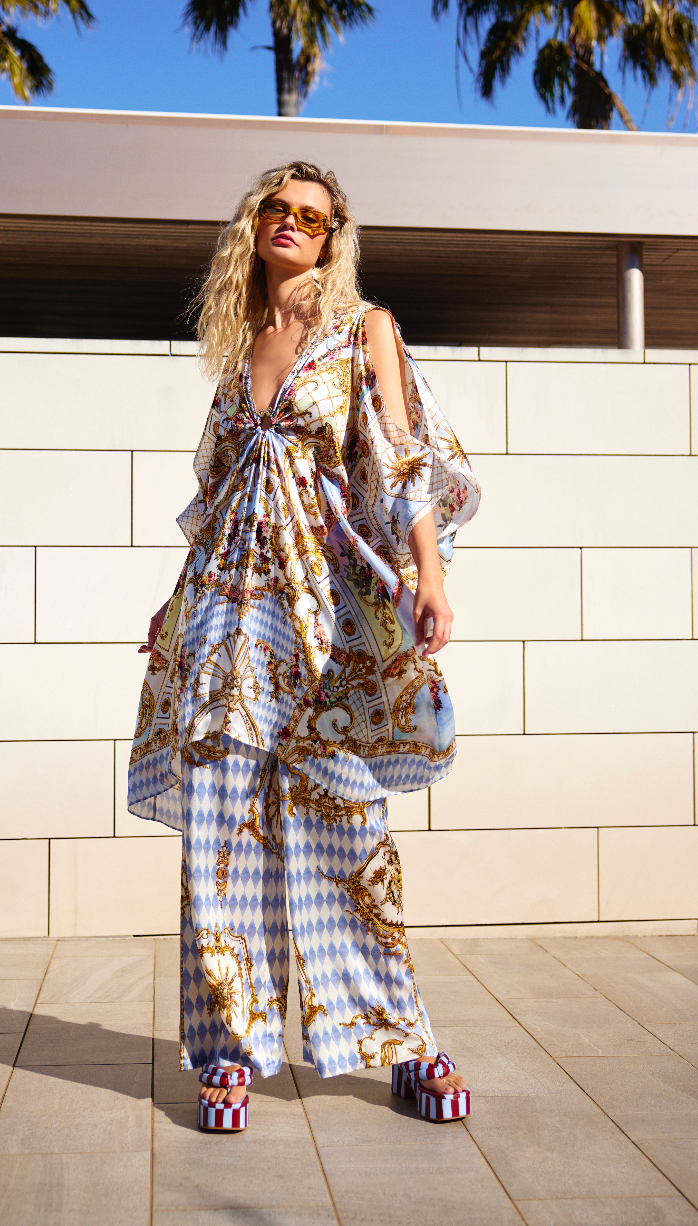 Designed in Australia, The Throne Games Kimono Sleeve Dress With Shirring Detail welcomes you to the Palace of Queluz, where ornate rococo details and fine architectural artistry are framed by an elegant floral border. Lovingly