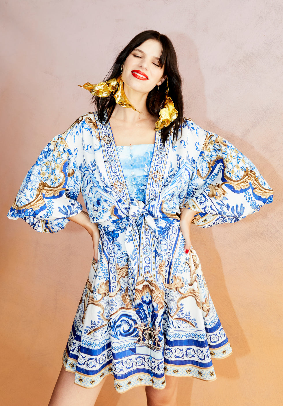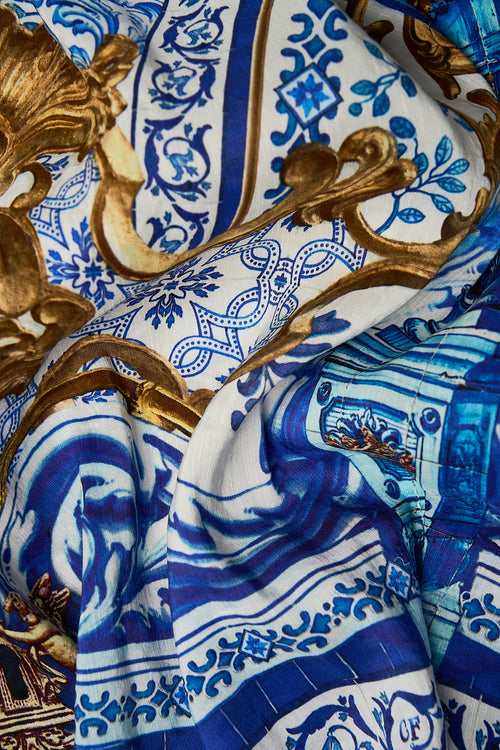 Designed in Australia, The Azul Adventures Long Button Front Dress echoes the rich blue and yellow hues of Queluz Palace's artwork, featuring hand-painted motifs and scenes of Portuguese life, a tribute to Leho tilework and