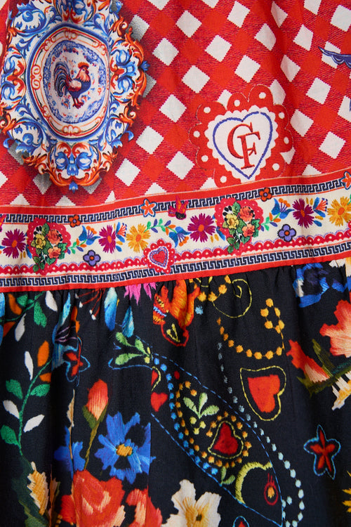 Designed in Australia, The Folk Fabulous Tiered Bodice Dress celebrates the colourful Barcelos Cockerel set against archways and folk-inspired blooms, while dark accents and embroidery evoke the charm of Portuguese kitsch and tradition. Lovingly handcrafted,