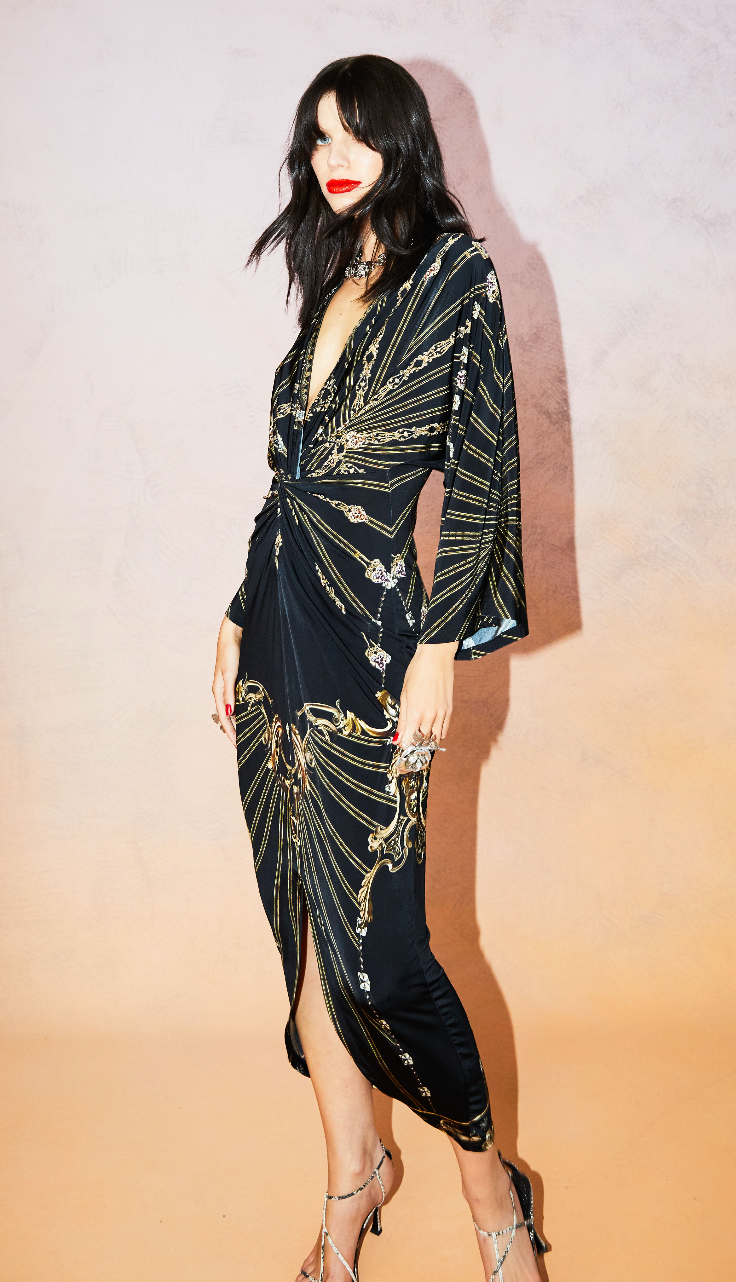 Designed in Australia, Baroque Around The Clock Long Split Front Twist Dress celebrates the architectural beauty of Portugal’s most stunning churches, evoking a sensory journey that blends memories and wanderlust into each hand illustrated design. Lovingly handcrafted, this CAMILLA jersey midi dress features a relaxed fit throughout the body with a twist drape detail upon the waist. The skirt skims the curves and tapers into a midi length slightly high low hemline with a curved front split for effortless elegance.