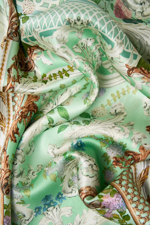 Designed in Australia, The Pestana Panorama Gathered Bodice Bias Dress welcomes you to Pestana Palace—a haven of serene greens and gilded accents, where every detail whispers quiet luxury. Lovingly handcrafted, this CAMILLA silk dress features