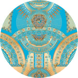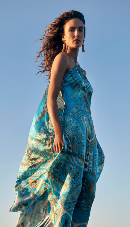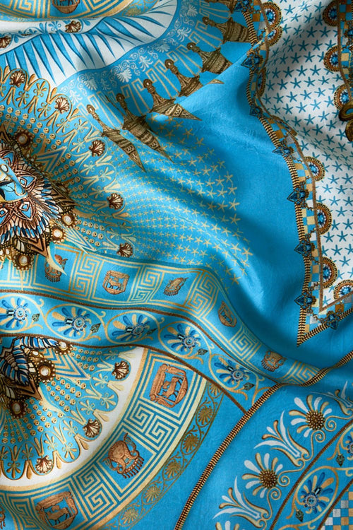 Designed in Australia, The Temple Of Light Tie Waist Strapless Jumpsuit unearths the opulence of Dendera and Hatshepsut’s divine legacy. Adorned with celestial motifs and majestic gold arches against a radiant aqua backdrop. Lovingly handcrafted, this luxury silk jumpsuit features a relaxed blousy bodice that flows into a wide leg trouser that falls into a full length hemline. With a lavish sash waist tie and pocket details this CAMILLA jumpsuit exudes luscious wearability.