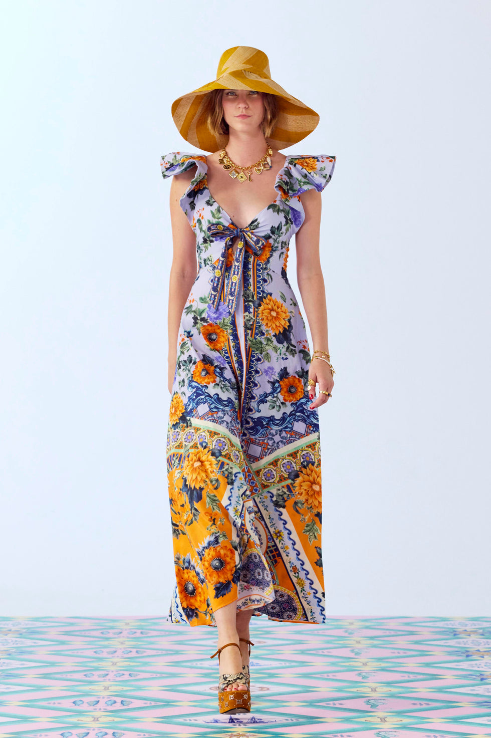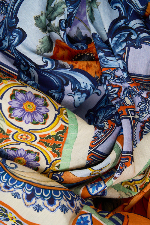 Designed in Australia, the Luscious In Lisbon Puff Sleeve Shirt Dress renders tiles as stories - orange florals bloom upon a lavender haze, a canvas of vibrant ceramic artistry that echoes a timeless imagination. Lovingly handcrafted, this puff sleeve shirt dress is a celebration of feminine style. A relaxed fit and shorter length combined with a tiered skirt and voluminous puff sleeves create a playful silhouette.