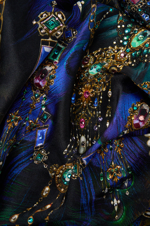 Designed in Australia, the Dominican Decadence V-Neck Bias Cami unfolds in decadent plumes and iridescent blues, teal waves shimmer like glass, capturing the sparkle of forgotten monuments. Lovingly handcrafted, this luxury silk cami with a