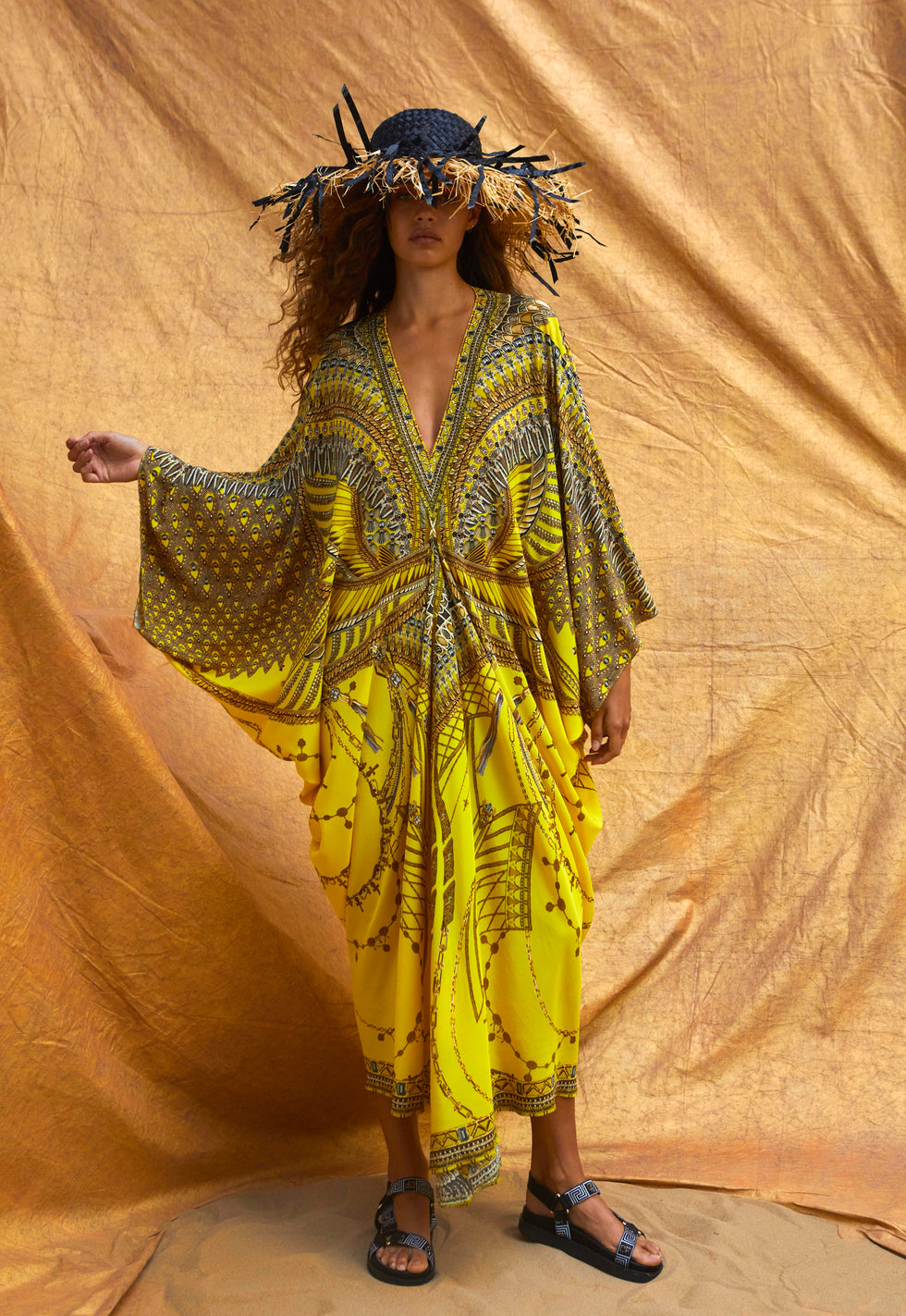 Designed in Australia, The Shrine Of Sunshine Strapless Maxi With Ruffle Hem embraces the ethereal charm of ancient realms. This design features gleaming yellow tones interwoven with delicate flecks of gold, capturing the timeless elegance and divine radiance of deities. Lovingly handcrafted, this maxi dress features a flared silhouette with a strapless design and optional straps. The ruffle hem adds a touch of elegance, while the invisible zip at the center back ensures a seamless fit.