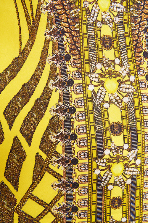 Designed in Australia, The Shrine Of Sunshine Strapless Maxi With Ruffle Hem embraces the ethereal charm of ancient realms. This design features gleaming yellow tones interwoven with delicate flecks of gold, capturing the timeless elegance