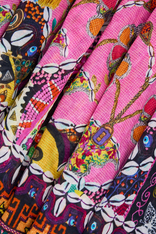 The Patchwork Panorama Long Tiered Dress With Bow Ties is a handcrafted cotton silhouette designed by our in house artisans. Reimagined in an exclusive limited edition print, this tiered maxi dress features a reversible front and back style for effortless versatility. It's adorned with delicate lace trim accents and soft gathering throughout the tiered skirt. It's finished with side ties that are ornamented with beads and crochet motifs for opulent detail.