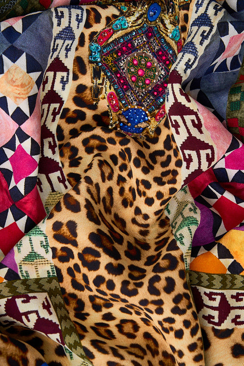 The Embroidered Ever After Scoop Back Hem Dress is a handcrafted silk silhouette designed by our in house artisans. Reimagined in an exclusive limited edition print, this dress is cut in a relaxed fit and features a round neckline and asymmetrical scooped back hemline. It' adorned with 3/4 length sleeves that dance below elbow length and its finished with intricately placed crystal embellishments for luminous detail.