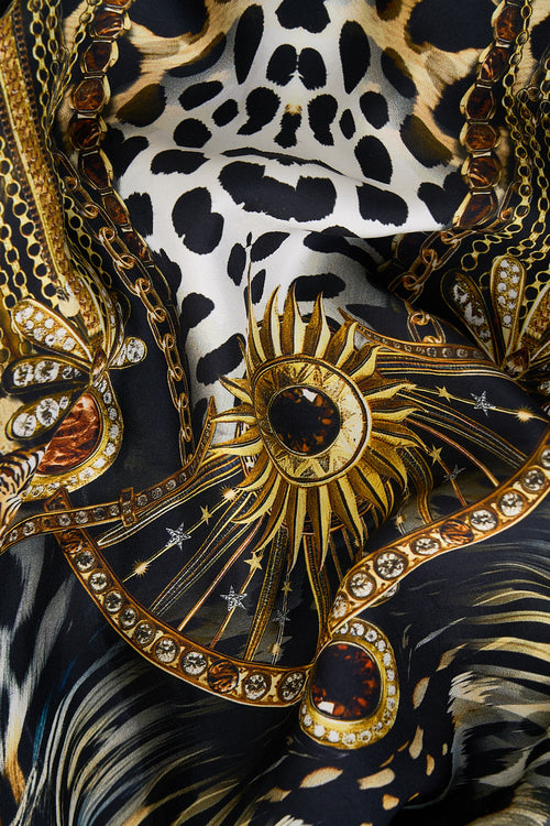 The Feline Folklore One Shoulder Dress With Blouson Sleeve is a handcrafted silhouette designed by our in house artisans. Reimagined in an exclusive limited edition print, this asymmetrical one shoulder dress is relaxed fitting and falls to a full length hemline. It features an elasticated neckline that meets an asymmetrical blouson sleeve and is finished with intricately placed crystal embellishments.