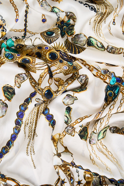 The Chain Gang Twist Front Batwing Dress is a handcrafted silhouette designed by our in house artisans. Reimagined in an exclusive limited edition print, our batwing dress features a statement twist across the front and full-length sleeves. Finished with crystal embellishment, a modesty button has been added at the neckline for styling versatility.